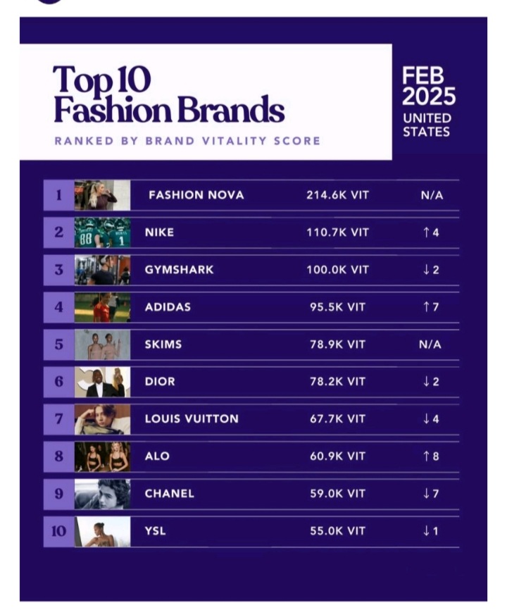 Raksasa media sosial. Fashion Nova mendominasi dengan jaringan influencernya yang luas, siklus tren yang cepat, dan kehadiran Tik Tok yang konstan. Beberapa merek mengubah energi virus menjadi relevansi budaya secara efektif.