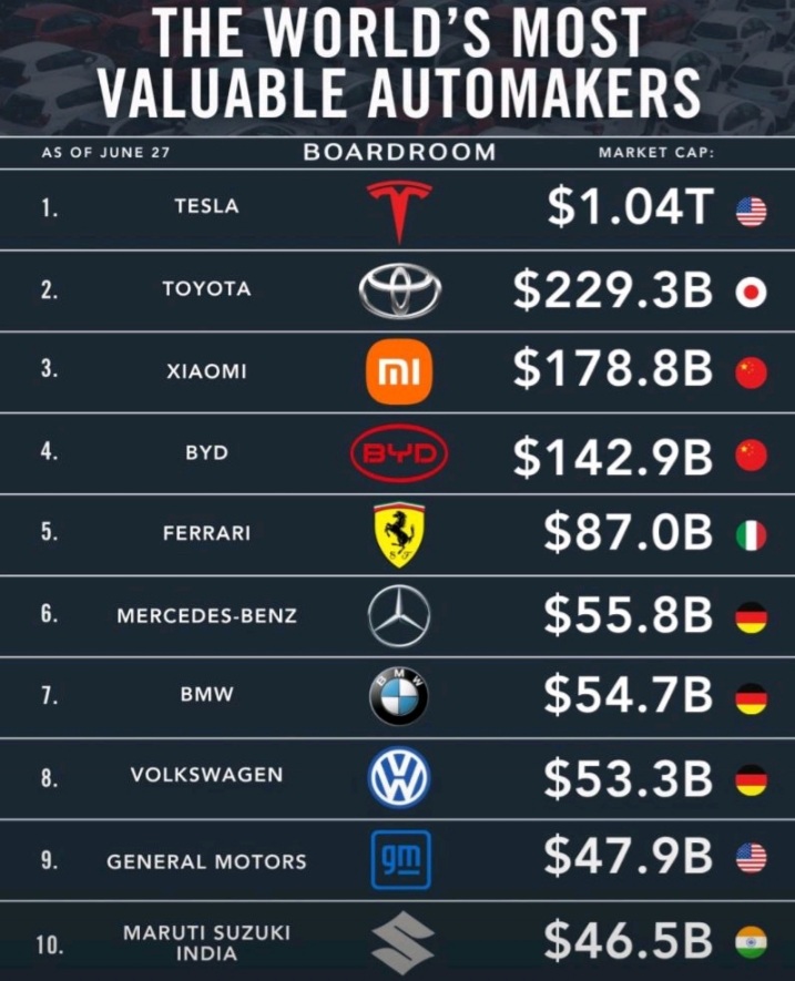 Menurut data yang diterbitkan oleh Boardroom, berikut adalah pembuat mobil paling berharga di dunia berdasarkan kapitalisasi pasar per 27 Juni 2025: