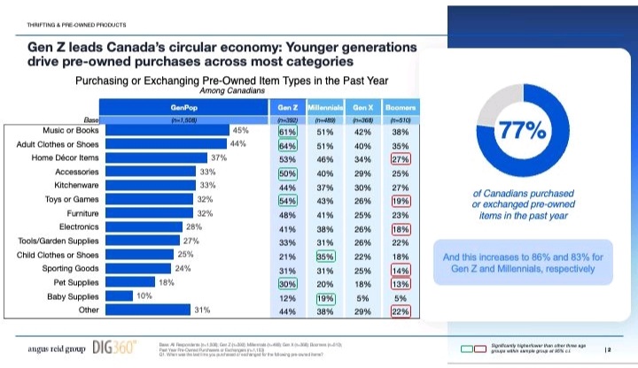 Hasil dari survei akhir Mei, terhadap 1.508 orang dewasa Kanada. Pada pertengahan Mei, 77% orang Kanada telah membeli atau menukar setidaknya satu barang bekas dalam setahun terakhir. Orang Kanada yang lebih muda (Gen Z & Milenial) secara signifikan lebih terlibat dalam belanja bekas di hampir semua kategori, seperti halnya rumah tangga dengan anak-anak.