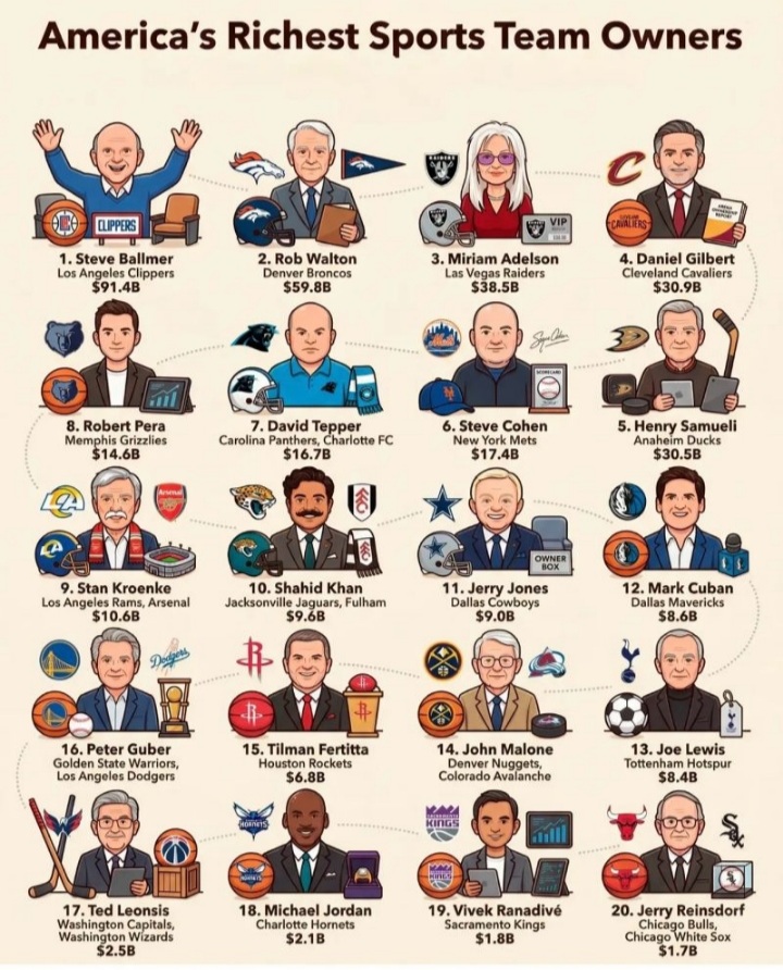 Di bagian atas duduk Steve Ballmer dari Los Angeles Clippers, diikuti oleh Rob Walton dari Denver Broncos serta Miriam Adelson, yang dikaitkan dengan benar dengan Dallas Mavericks daripada Las Vegas Raiders.