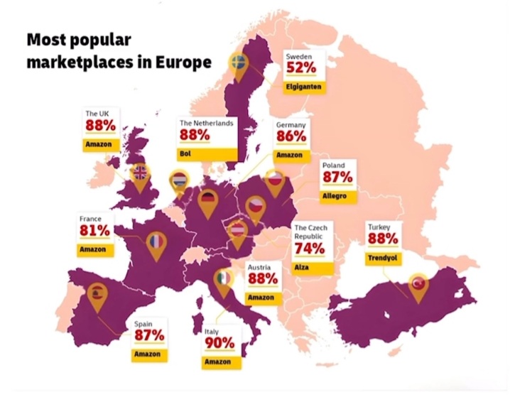 Namun, nuara lokal yang kuat masih menang. Seperti: Belanda: bol (Ahold Delhaize) (88%), Polandia: Allegro (Cinven/Permira/MidEuropa) (87%), Republik Ceko: Alza.cz as. ( Allegro/) (74%), Swedia: Elgiganten AB ( Elkjøp/ Currys plc) 52%), dan Turki: Trendyol Group Alibaba Group) (88%).