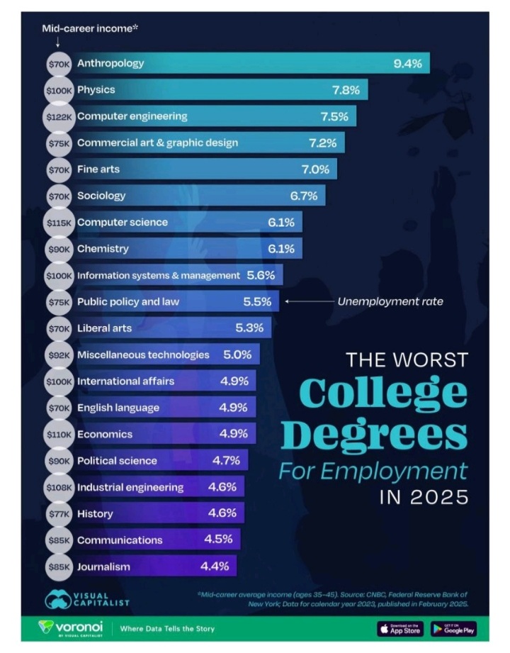 Menurut sebuah studi baru-baru ini yang divisualisasikan oleh Visual Capitalist menggunakan data dari CNBC dan Federal Reserve Bank of New York, jurusan perguruan tinggi dengan tingkat pengangguran tertinggi pada tahun 2025 melukiskan gambaran yang serius bagi para pencari kerja.