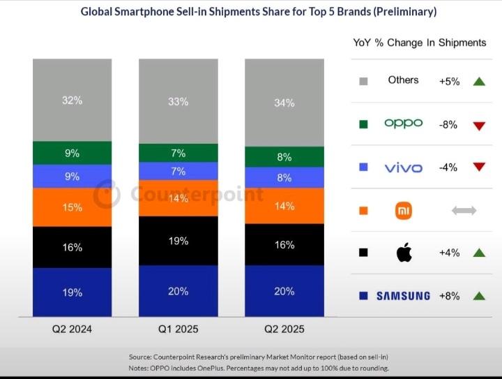 RINCIH.COM. Counterpoint Research melaporkan, pengiriman smartphone global naik 2% YoY pada Q2 2025 karena pertumbuhan pasar yang semakin maju. Sementara Samsung terus memimpin