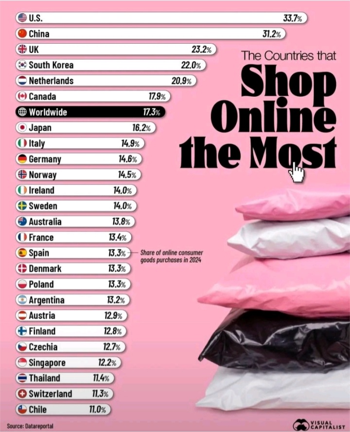 Berikut adalah bagian barang konsumsi yang dibeli secara online di setiap negara: Amerika Serikat 33.7%, Cina-31.2%, Inggris Raya – 23.2%, Korea Selatan 22.0% dan Belanda 20.9%