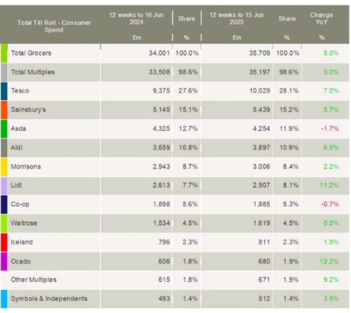 Paul Stainton, Private Label Expert mengatakan, pertumbuhan penjualan Tesco semakin cepat, dan pangsa pasar Asda turun di bawah 12% untuk pertama kalinya adalah berita utama dari data pasar Inggris Worldpanel by Kantar selama 12 minggu yang berakhir pada 15 Juni 2025, yang dirilis hari ini.