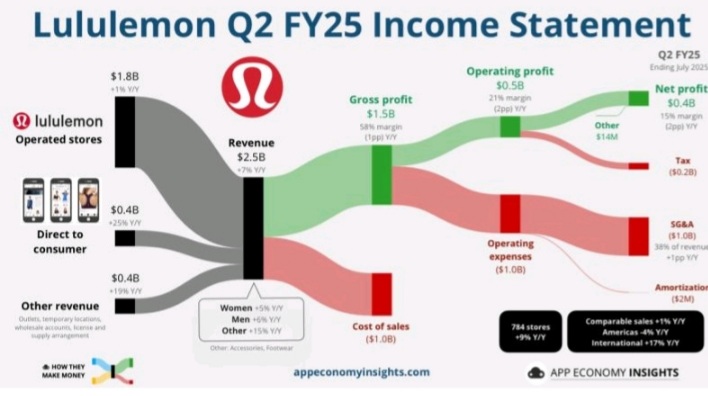 Hasil Q2 FY25 (berakhir Juli 2025) mengungkapkan merek yang masih tumbuh dan berkembang. Pendapatan: $2.58 (+7% YoY). Toko yang dioperasikan: $1,8 miliar (+1%). Langsung ke konsumen: $0.4 miliar (+25%). Pendapatan lainnya: $0,4 miliar (+19%). Laba kotor: $1,5 miliar (margin 58%, +1pp YoY). Laba operasional: $0,5 miliar (margin 21%, +2pp YoY). Laba bersih: $0,4 miliar (margin 15%, +2pp YoY).