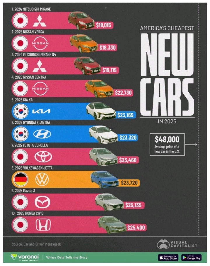 Grafik baru dari Visual Capitalist (menggunakan data dari Car and Driver Magazine dan MoneyGeek) menyoroti mobil baru paling terjangkau di Amerika, dan semuanya berasal dari Jepang, Korea Selatan, dan satu pembuat mobil Jerman: