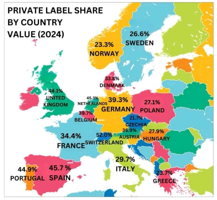 Pasar utama di Jerman, inggris, dan Prancis secara kolektif memegang pangsa label pribadi sebesar 39,7%, naik 0,1 poin persentase dari tahun sebelumnya.