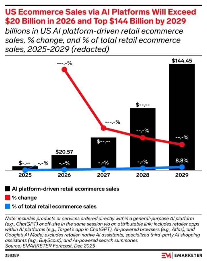 Pada tahun 2026, 95% penjualan e-niaga berbasis platform Al masih akan diselesaikan di luar lokasi, di situs web pengecer-bukan langsung di dalam alat Al melalui fitur seperti Checkout Instan ChatGPT.