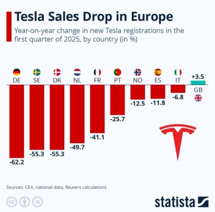RINCIH.COM. Penjualan Tesla dalam pendaftaran mobil baru di seluruh Eropa untuk Q1 2025 dan hampir setiap negara mengalami penurunan tajam. Misalkan di Jerman: -62,2%, Swedia dan Denmark: -55,3%, Belanda: hampir -50%.