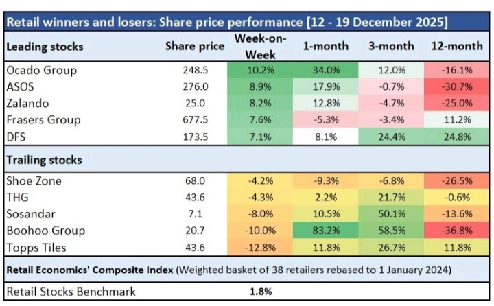 Topps Tiles (-12,8%) adalah yang terlemah di antara rekan-rekan karena kategori perbaikan rumah merasakan tekanan dari konsumen yang berhati-hati menjelang Natal. (NcangSepti, RetailEconomics)