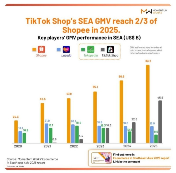 Menurut laporan Momentum Works Ecommerce in Southeast Asia 2026, Shopee tetap menjadi platform terkemuka, mencapai perkiraan US$83,2 miliar GMV pada tahun 2025. Hal ini mencerminkan pertumbuhan yang konsisten dari US$24,3 miliar pada tahun 2020, memperkuat keunggulan skalanya di beberapa pasar Asia Tenggara.
