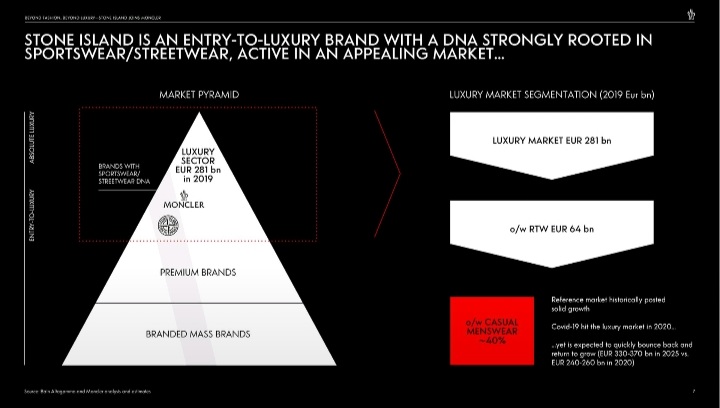 Diposisikan dalam tingkat masuk ke kemewahan dari piramida pasar mewah, Stone Island berdiri bersama merek-merek seperti Moncler, beroperasi di ruang yang menjembatani premium dan kemewahan mutlak.
